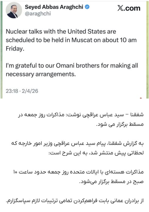 Сайидаббос Ироқчӣ, вазири корҳои хориҷаи Ҷ.И.Эрон дар шабакаи иҷтимоии Х тасреҳ кард:"Музокироти ҳастаӣ бо Иёлоти Муттаҳидаи Омрико рӯзи ҷумъа ҳудуди соати 10 дар Масқат баргузор мешавад. Аз бародарони уммонӣ бобати фароҳам кардани тамоми тартиботи лозим сипосгузорам."