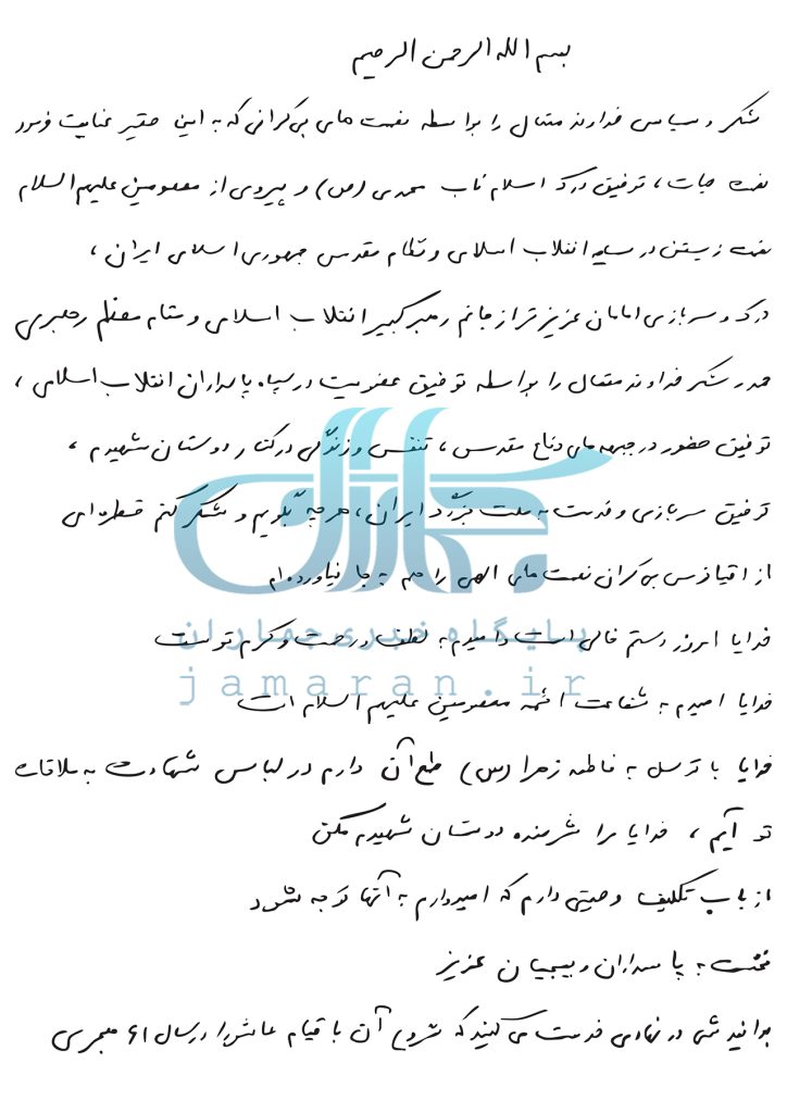 Умедворам, бо шафоати аиммаи (имомомни) маъсумин алайҳимус-салом бавежа Фотимаи Заҳро (с) ва дуои миллати Эрон, пок ва дар либоси шаҳодат маҳшур шавам!