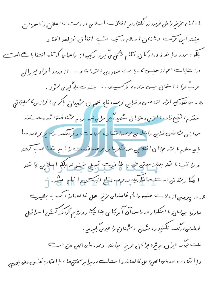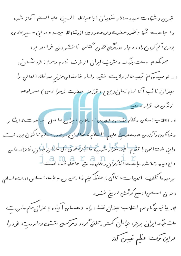 2. Инқилоби Исломӣ ва низоми муқаддаси Ҷумҳурии Исломии Эрон ҳосили муҷоҳидат, исор (аз худ гузаштагӣ) ва фидокорӣ ва орзуи ҳамаи маъсумин алайҳимус-салом, солеҳон аз садри ислом то кунун будааст ва ин неъмати илоҳӣ бо тақдими чанд ҳазор шаҳид, ҷонбоз, хуни дили модарону падарон ва хонаводаҳои доғдида ва талош ва муҷоҳидати исоргарон ва уламои роҳи ҳақ ҳосил шудааст. Бар ҳамаи мо таклифи илоҳист, то онро ҳифз кунем ва то расидан ба ҷомеаи исломӣ, давлати исломӣ ва тамаддуни исломӣ, аз ҳеч кӯшише дареғ нашавад;