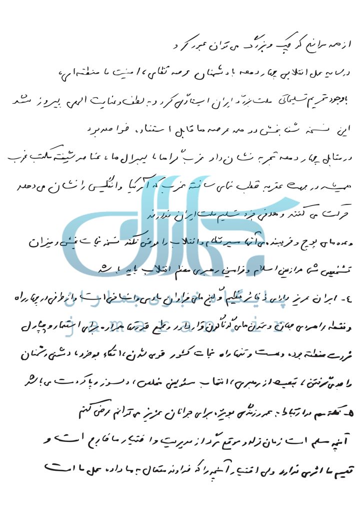 7. Эрон азиз дорои захоири азим ва ганҷҳои фаровони моддӣ ва инсонӣ аст ва аз тарафе дар чаҳорроҳ ва нуқтаи роҳбурдии ҷаҳон ва тамаддунҳои гуногун қарор дорад ва тамаъи қудратҳо ҳамвора барои истеъмор ва чаповули сарвати минтақа буда ва ҳаст. Ва танҳо роҳи наҷоти кишвар, қавӣ шудан, иттико ба худ, душмании душманонро ҷиддӣ гирифтан, табаият аз раҳбарӣ, интихоби масъулини мухлис, дилсӯз ва покдаст мебошад.