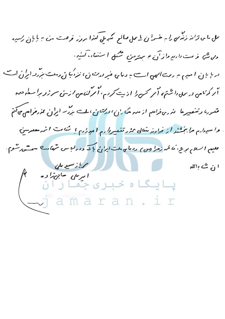 Агар кӯтоҳӣ дар амал доштам, агар касеро азият кардам, агар гуноҳе аз ман сар зад, ба воситаи ҳамаи қусурҳо ва тақсирҳо узр мехоҳам, аз ҳамаи ҳамкорон, дӯстон, миллати бузурги Эрон узрхоҳӣ мекунам ва умедворам маро бибахшанд, аз Худованди Мутаол узри тақсир дорам.