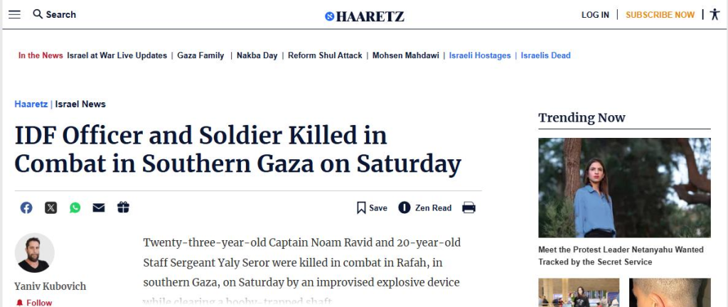 Рӯзномаи Haaretz дар пайи ду амалиёти муқовимати Ғазза, аз кушта ва захмӣ шудани 6 низомии саҳюнист хабар дод.