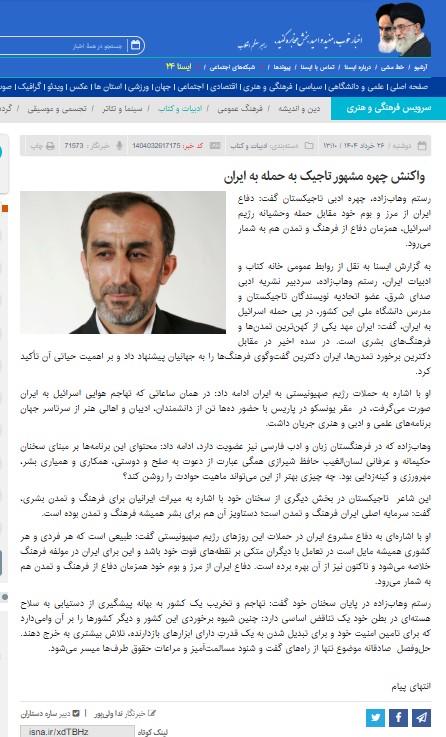 Рустами Ваҳҳобзода, чеҳраи адабии Тоҷикистон гуфт: “Дифоъи Эрон аз марзу буми худ муқобили ҳамлаи ваҳшиёнаи режими Исроил, ҳамзамон дифоъ аз фарҳанг ва тамаддун ҳам ба шумор меравад.”Ба гузориши Исно, Рустам Ваҳҳобзода, сардабири нашрияи адабии “Садои шарқ”, узви Иттиҳодияи нависандагони Тоҷикистон ва устоди донишгоҳи миллии ин кишвар, дар пайи ҳамлаи Исроил ба Эрон, гуфт: “Эрон маҳди …